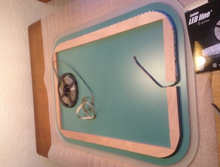 Na het maken van het houten frame (gemaakt van watervast verlijmd Oukume) wordt dit frame op de spiegel geplakt met zuurvrije spiegellijm. Hierna brengen we de RGB-strip aan en monteren de ophangset.