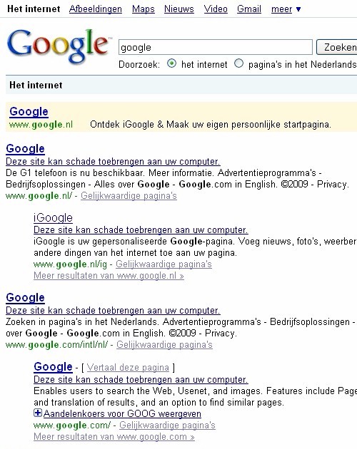 16:15 uur Stopbadware.org ligt eruit en ineens zijn alle resultaten voorzien van de melding: Deze site kan schade toebrengen aan uw computer. Ook die bij een zoekopdracht op Google zelf: